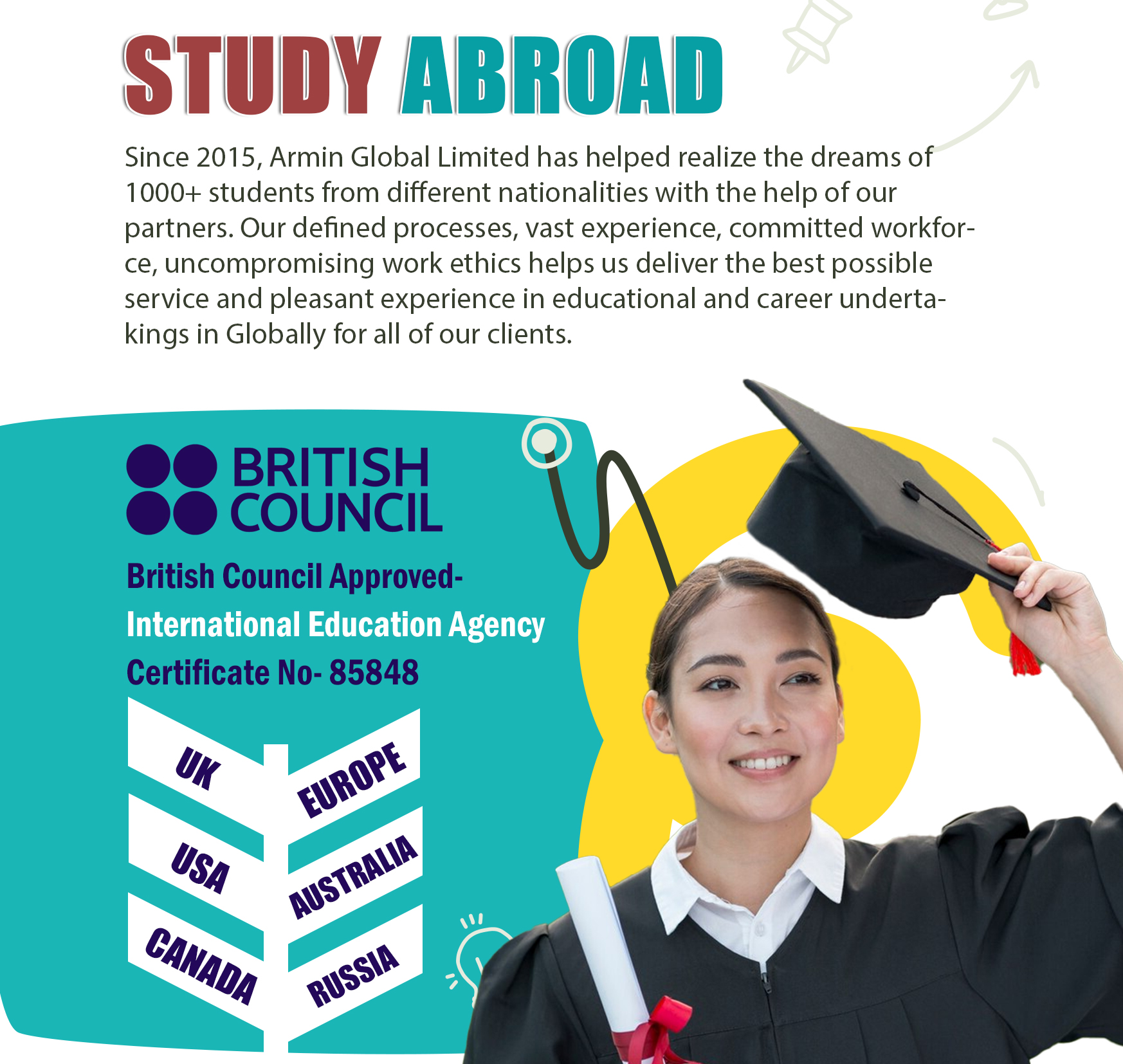 Armin Global LTD is a leading student consultancy agency and recruitment agency established in 2015 based in London, United Kingdom and Dhaka, Bangladesh. Our mission is to empower student consultancy, job seekers and businesses by connecting the right talent with the right opportunities. Our focus is on student consultancy with creating job opportunities for individuals in Bangladesh and other South Asian countries. With a team of experienced specialists and a collaborative approach, we deliver quality solutions that exceed our clients’ needs, helping both student consultancy job seekers and businesses achieve their goals. At Armin Global LTD, we are dedicated to delivering meaningful results through our proven expertise and experience in solving HR challenges, all while keeping our commitment to sustainability at the forefront.